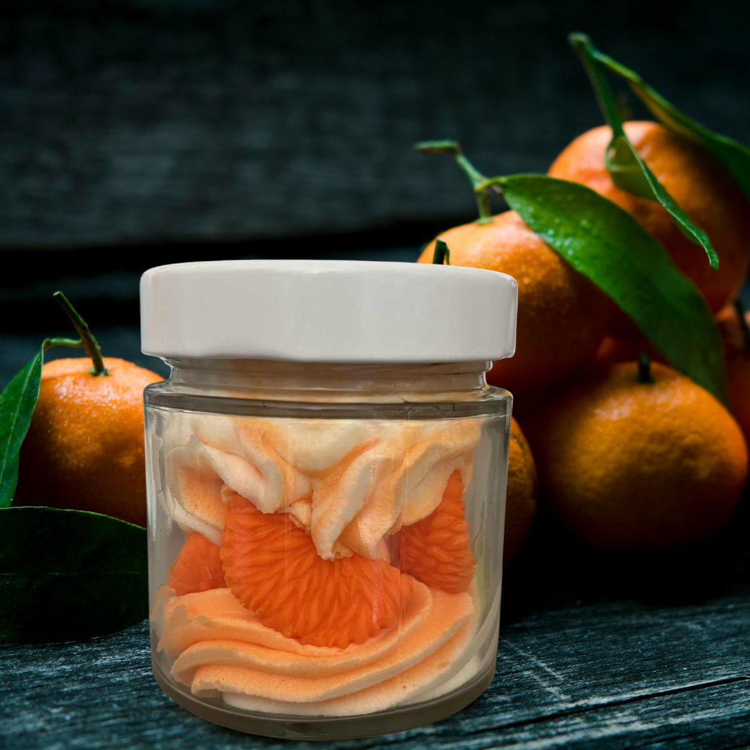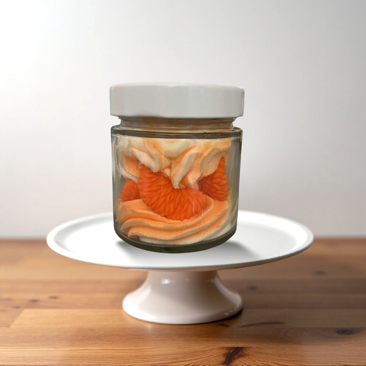 Façonnée avec soin dans une cire de karité onctueuse, elle présente un mélange bicolore d'orange et de blanc rappelant une délicieuse chantilly. Pour parfaire cette création, des petites tranches de clémentine en cire ont été délicatement ajoutées, créant un effet visuel aussi réaliste que gourmand.