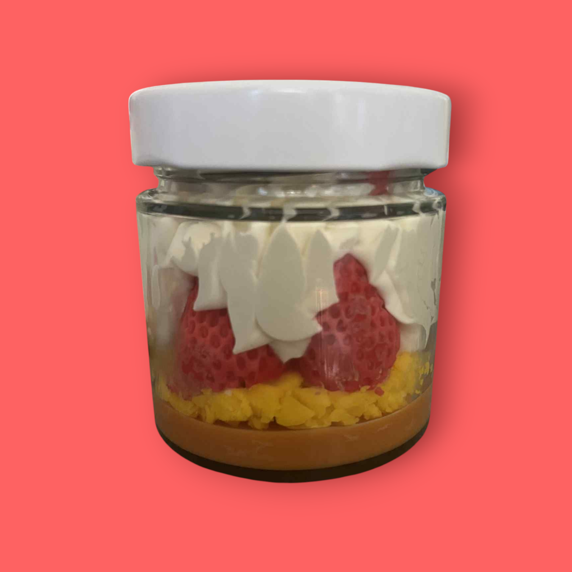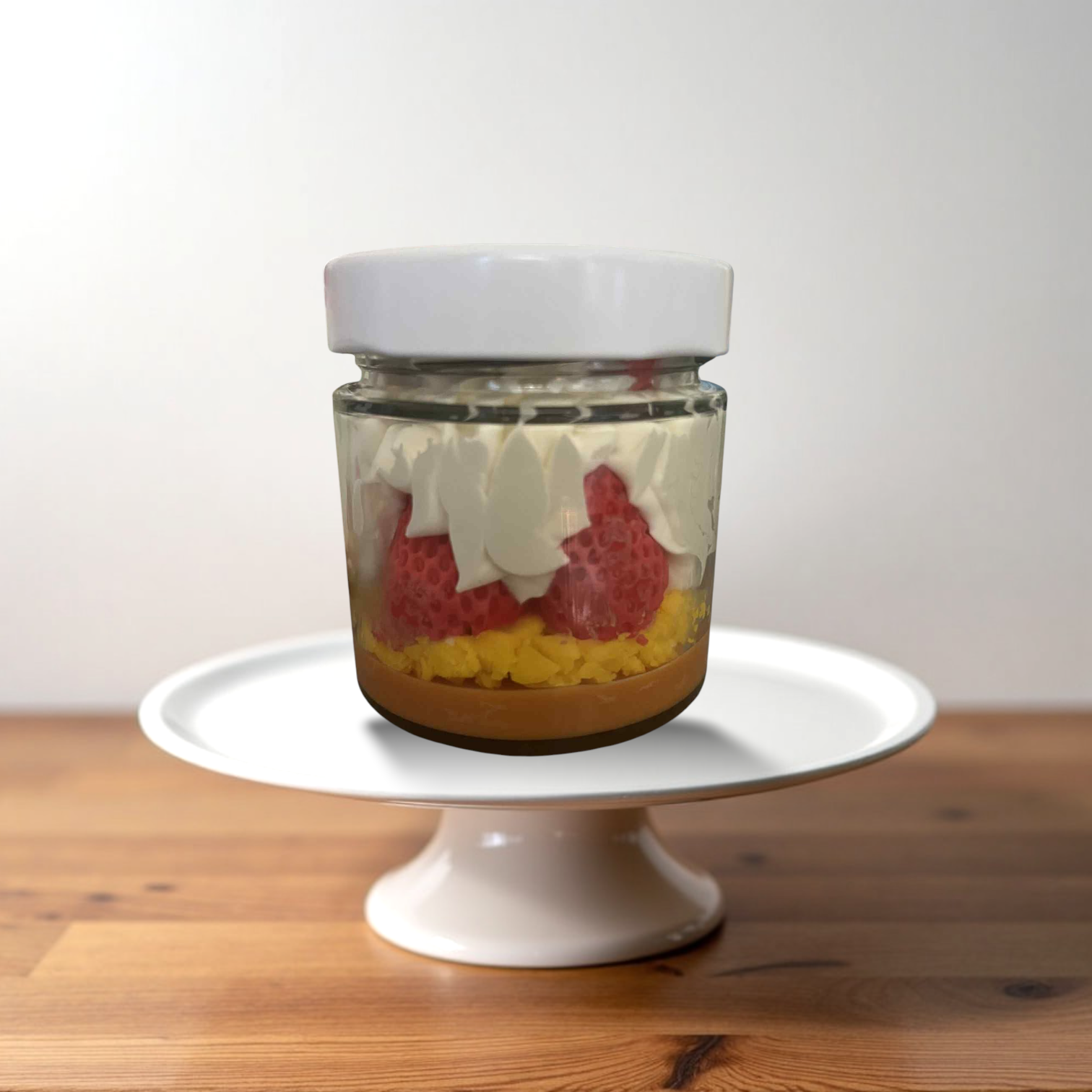 Façonnée à la main avec une cire de karité onctueuse et un parfum élaboré à Grasse, cette bougie est une véritable ode à la gourmandise. Un petit gâteau en cire repose délicatement à sa base, surmonté de fraises des bois et d'une chantilly, également en cire, pour un effet visuel irrésistiblement réaliste.