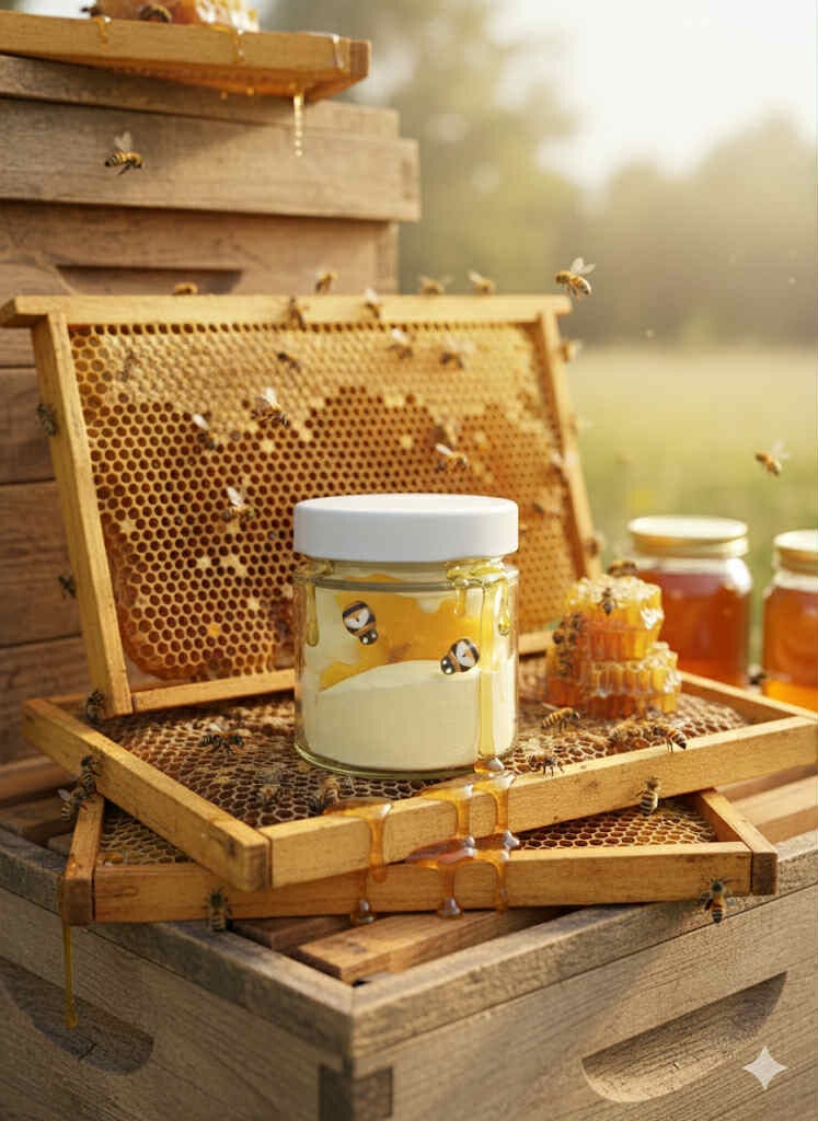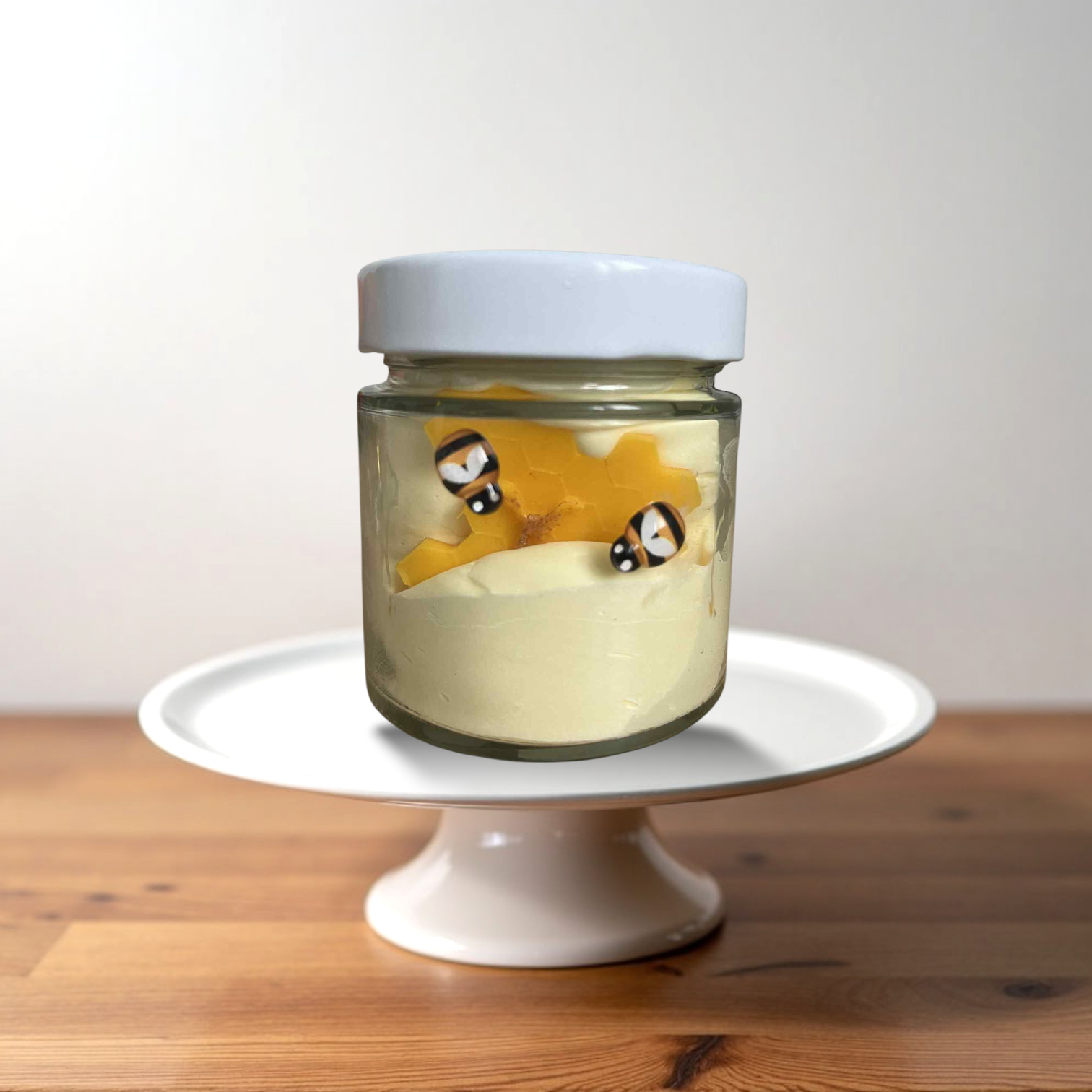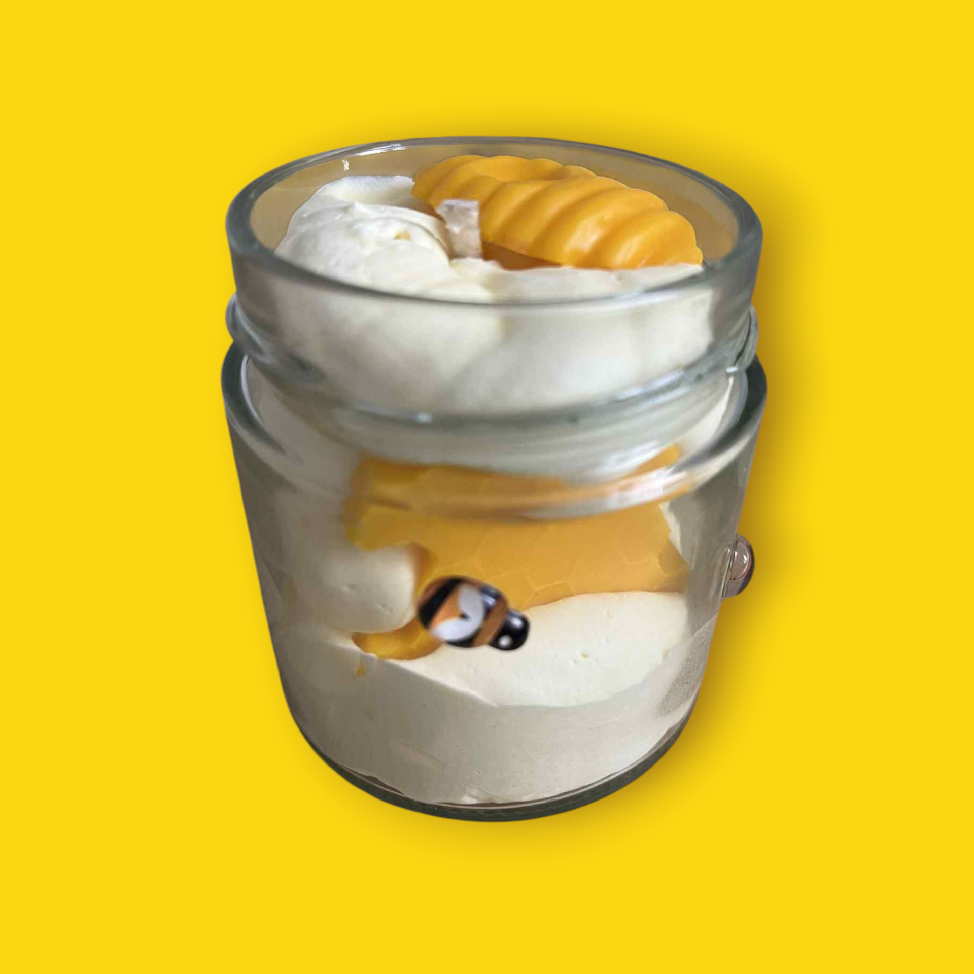 Mais l'expérience ne s'arrête pas là. Visuellement, elle est une œuvre d'art : le pot en verre abrite une texture évoquant une chantilly aérienne et immaculée, tandis que de charmantes petites abeilles sont délicatement collées sur la surface externe, veillant sur ce trésor olfactif.